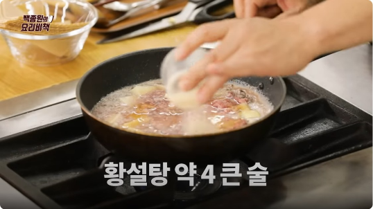 4. 냄비에 감자, 소고기, 황설탕 4큰술, 물엿 1/3컵, 물 약 2컵을 넣고 강불에 올린다.