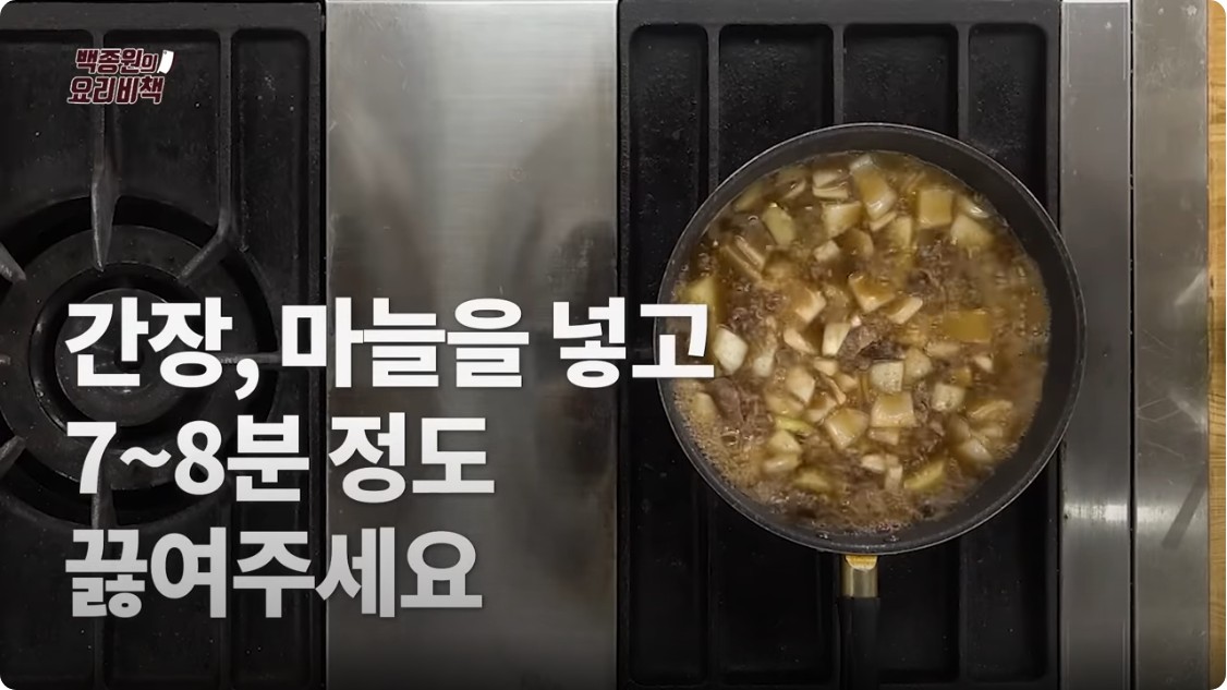 6. 다시 끓어오르면 진간장 2/3컵과 간 마늘 반 큰 술을 넣고 중불로 줄여 약 7~8분 정도 졸여준다.