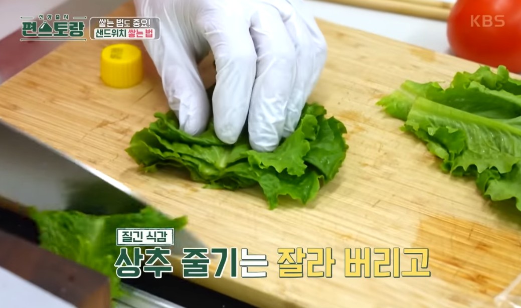 7. 토마토는 얆게 슬라이스 하고, 청상추는 줄기 부분을 잘라낸다.