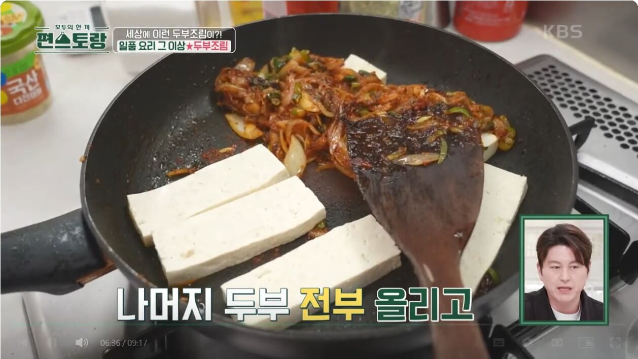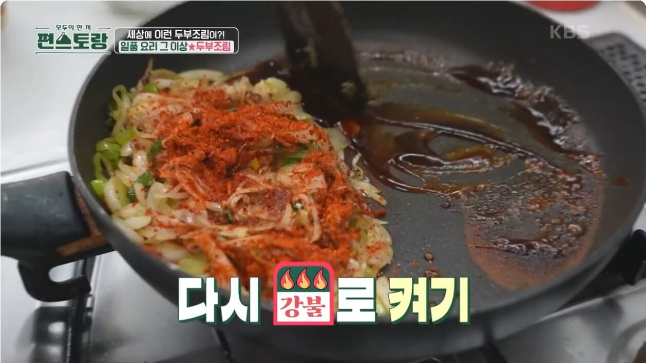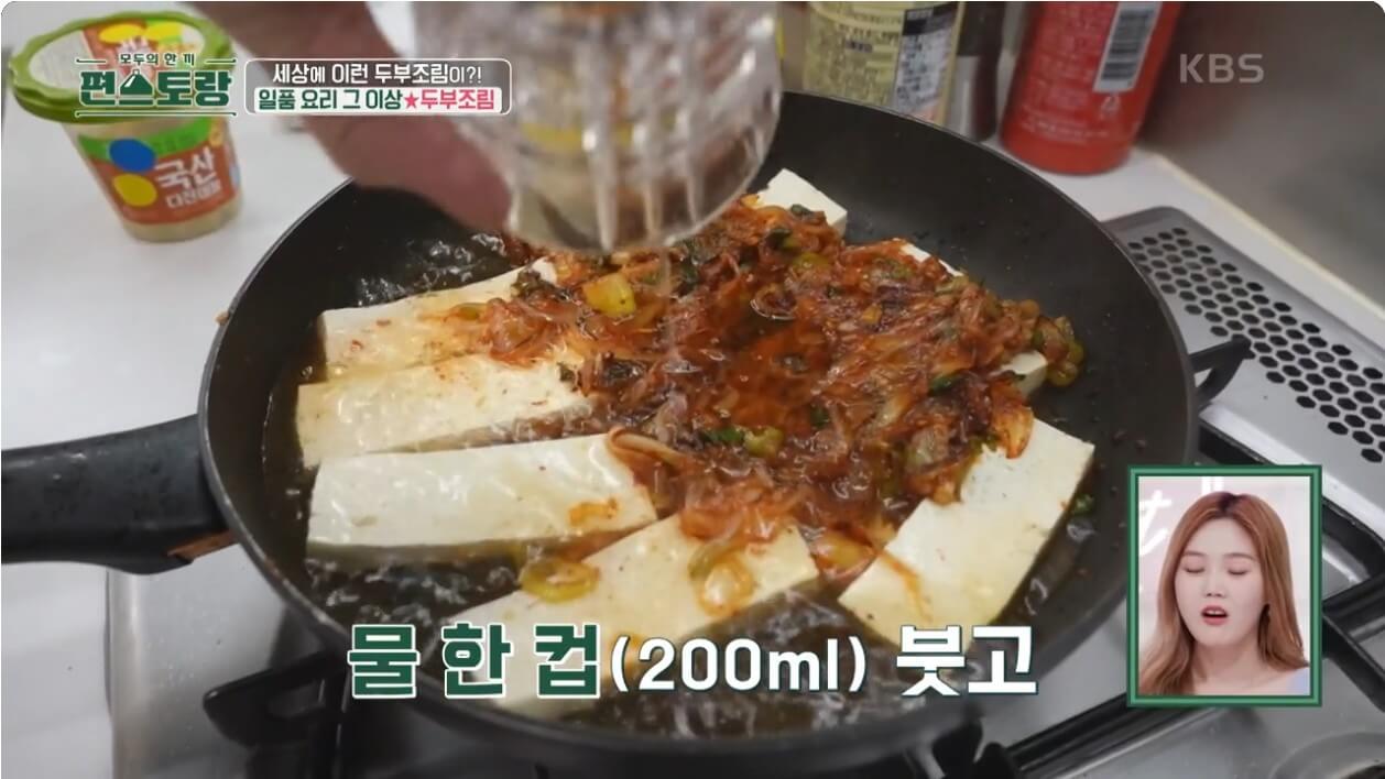 5. 다시 불을 끄고, 썰어둔 두부를 깔아 준 뒤 물 200ml를 넣고 불을 킨 후 강불로 끓여준다.