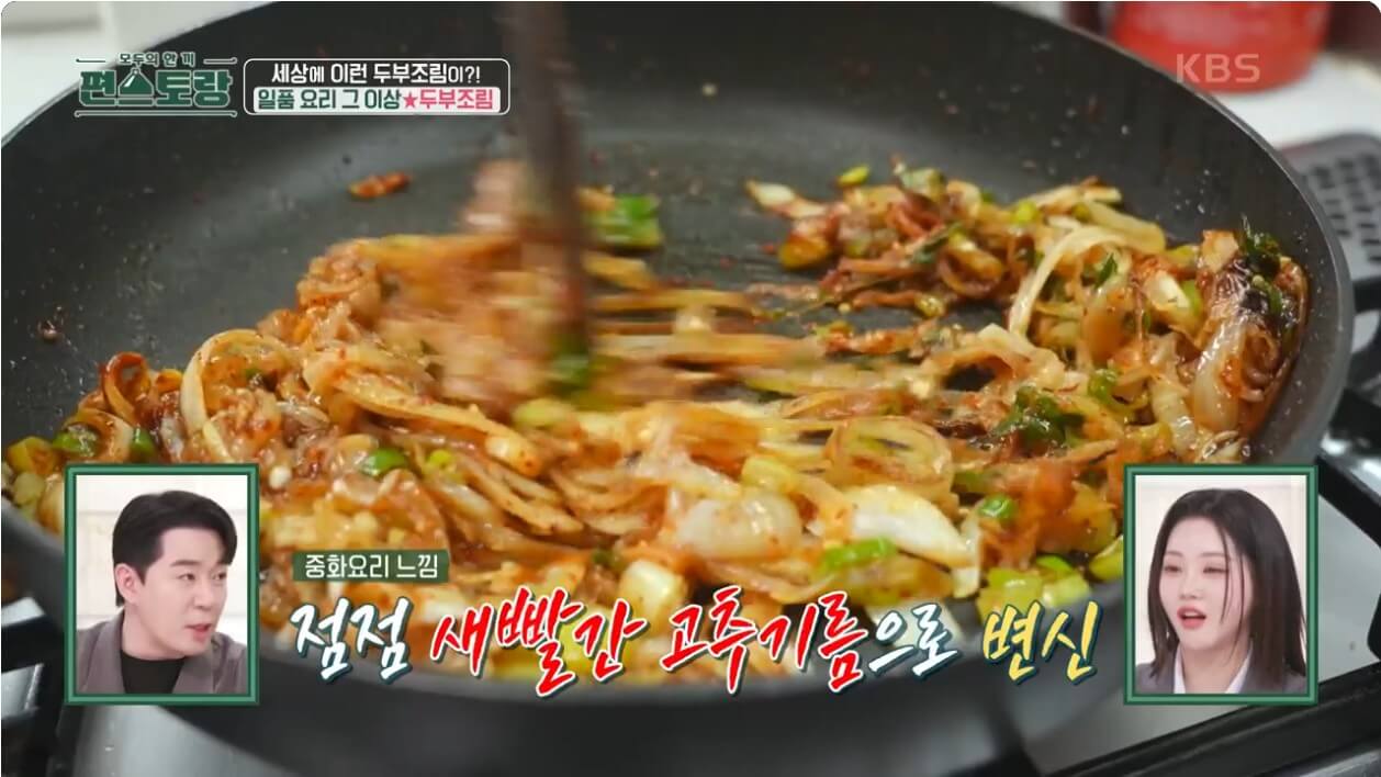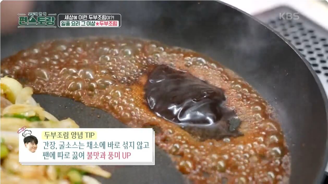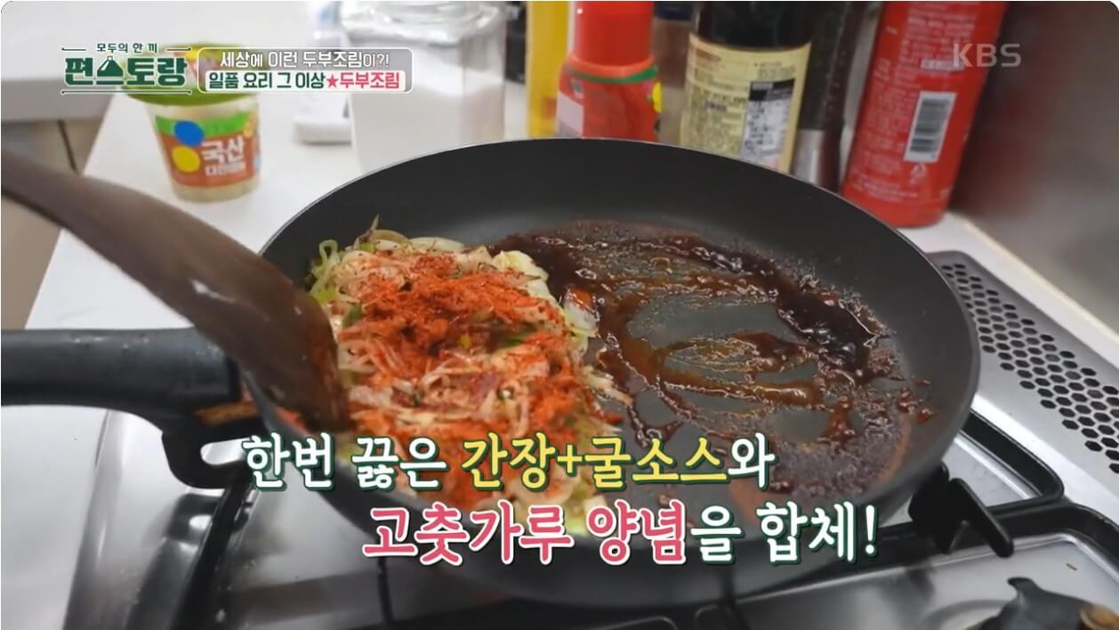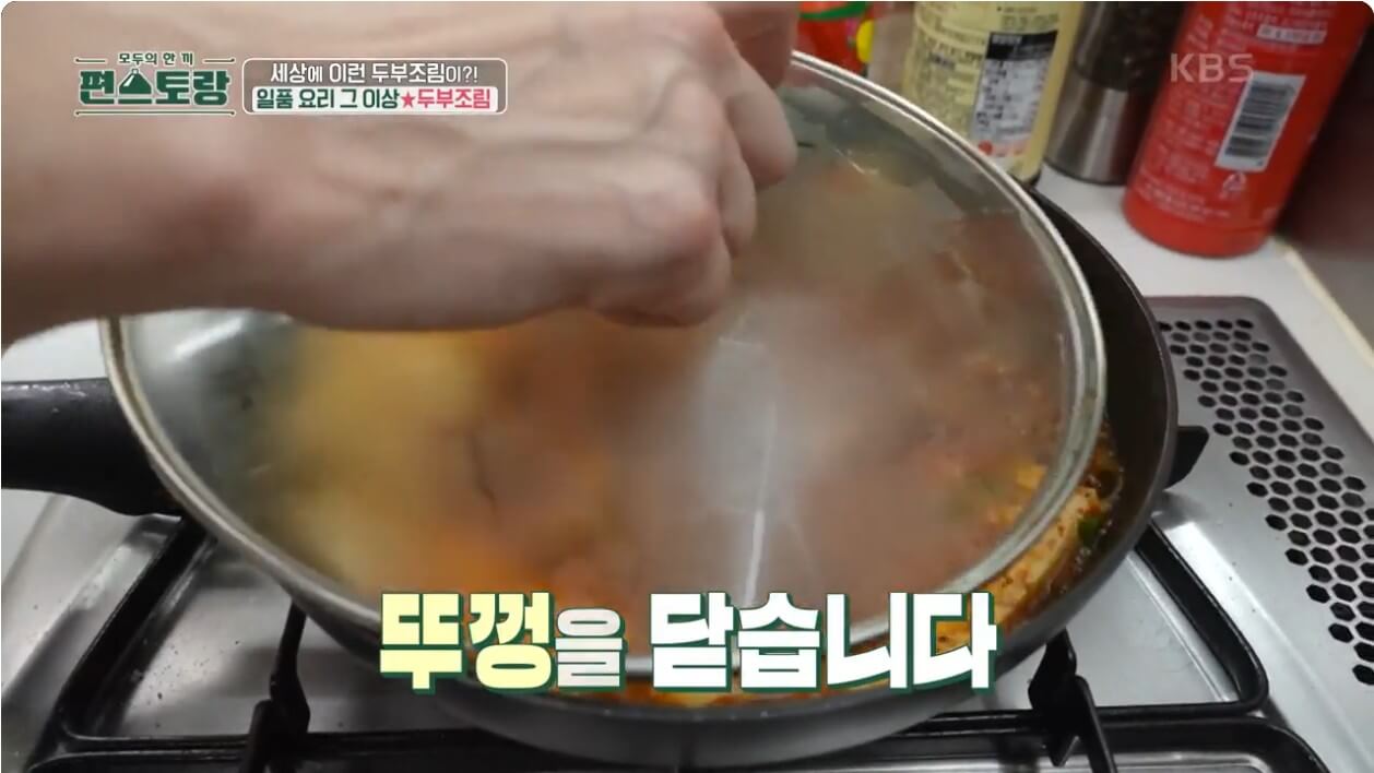 5. 다시 불을 끄고, 썰어둔 두부를 깔아 준 뒤 물 200ml를 넣고 불을 킨 후 강불로 끓여준다.