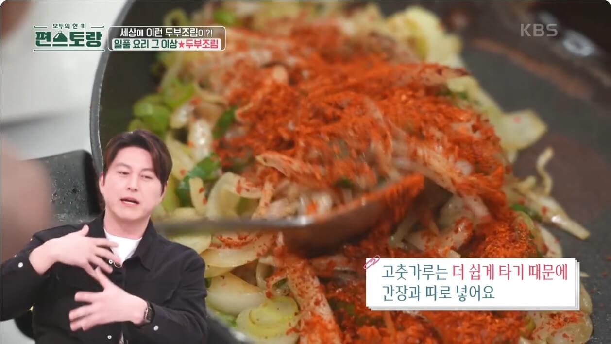 4. 채소 위에 고춧가루 1큰술을 뿌리고 다시 불을 켜 강불로 1분 정도 볶아준다.