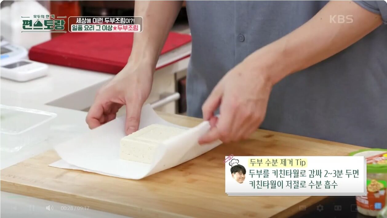 1. 두부를 키친타월로 감싸 수분을 제거하고 8등분 한다.