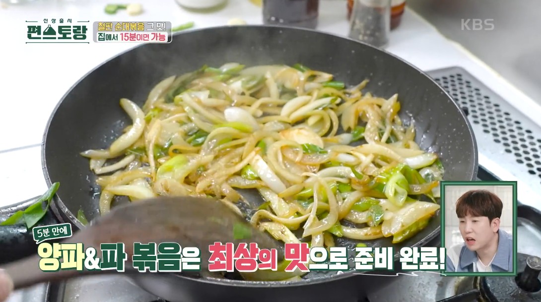 3. 강불에 예열한 팬에 식용유 두르지 않고 썰어둔 양파와 대파를 넣고 2~3분 정도 볶아준다.