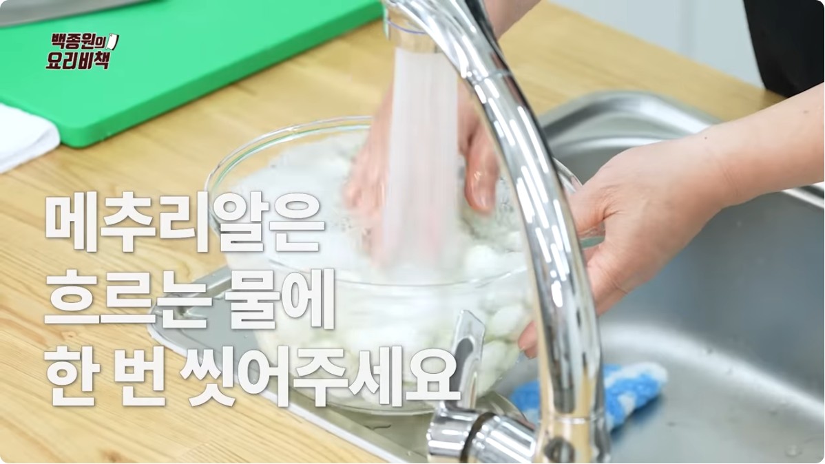 1. 깐 메추리알은 흐르는 물에 한번 헹궈준다.