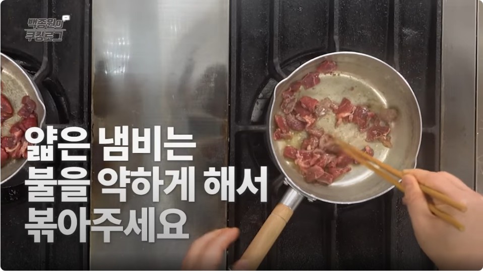 2. 냄비에 참기름 2큰술을 넣고 소고기 양지 1/2컵을 중약불에서 볶아준다.