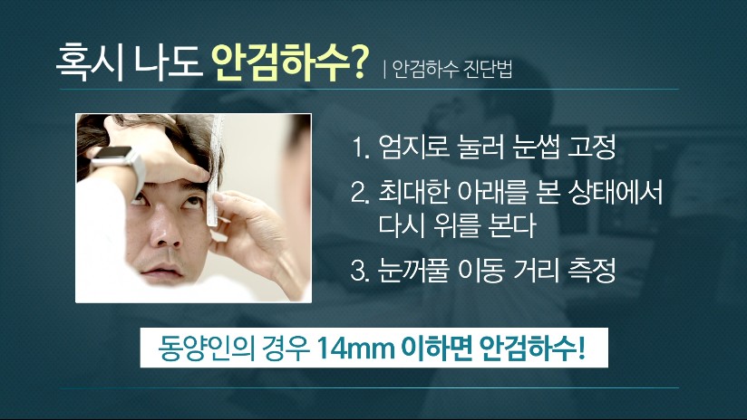 2. 정상인의 눈꺼풀은 14mm 이상 이동하고 안검하수가 있으면 이 상안검거근의 기능이 14mm 이하로 떨어지게 되는데 기능이 저하되는 정도에 따라 수술법이 달라진다.