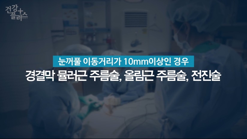 2. 올림근 주름 형성술 : 노인성 안검하수에서 주로 시행하는 방법으로, 늘어진 윗눈꺼풀 올림근의 주름을 잡아 짧게 해 주는 수슬이다.