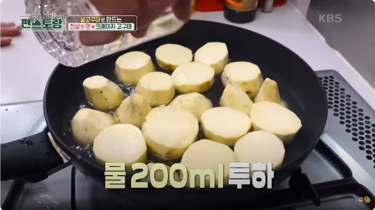 3. 팬을 중불로 예열한 후 고구마를 올린 뒤, 물 200ml를 넣고 뚜껑을 덮는다.