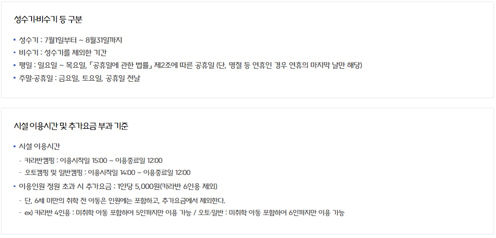 오토캠핑 및 일반캠핑 | 이용시작일 14:00 | 이용종료일 12:00 |