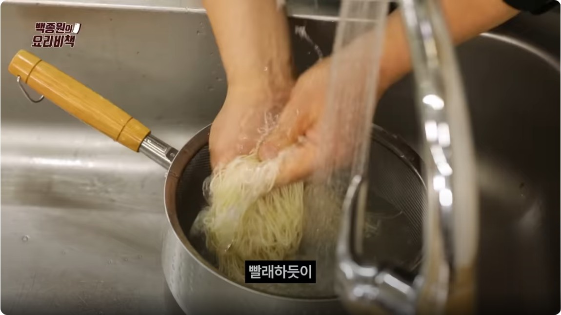 3. 소면이 익으면 찬물에 넣고 빨듯이 비벼서 전분을 제거해 준다.