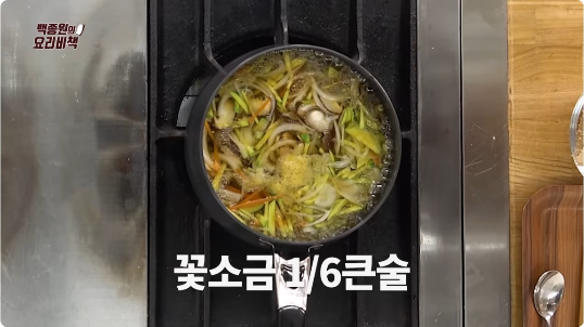 4. 육수가 끓으면 국간장 1/3컵, 꽃소금 1/6큰술을 넣어 간을 맞춘다.