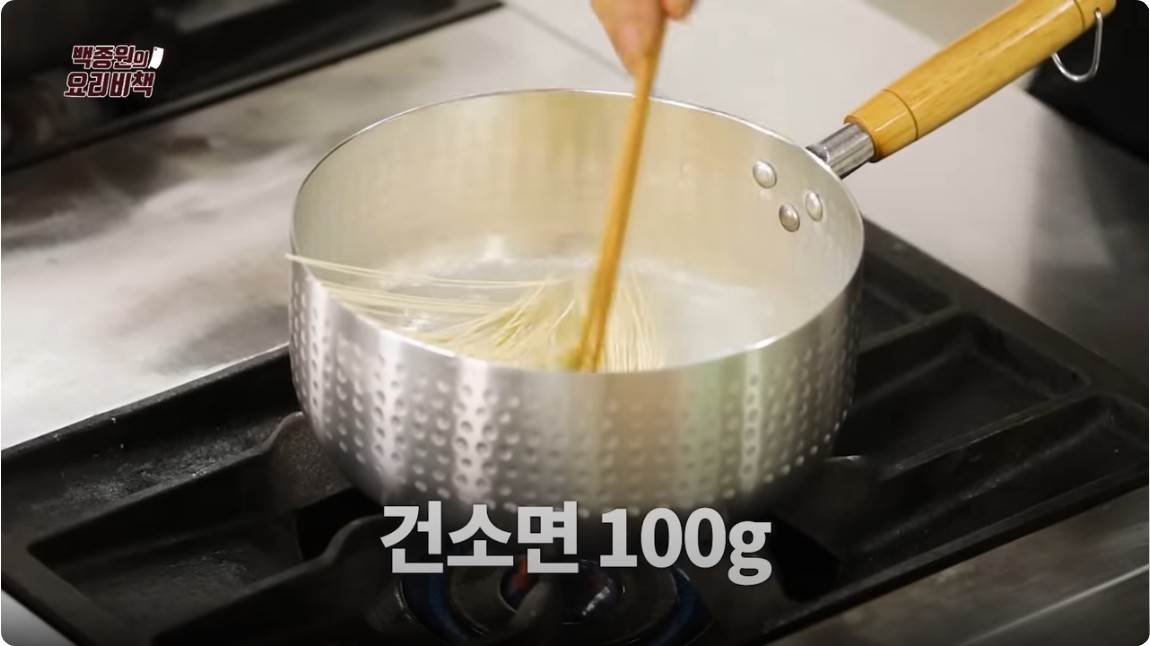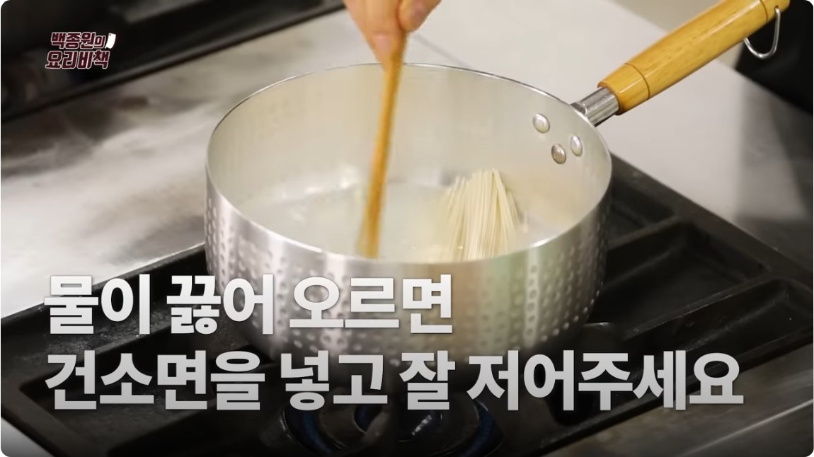 2. 물이 끓어오르면 소면을 넣고 저어가며 약 3분 30초간 삶아준다.