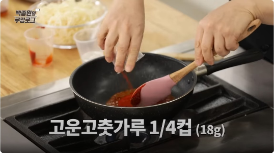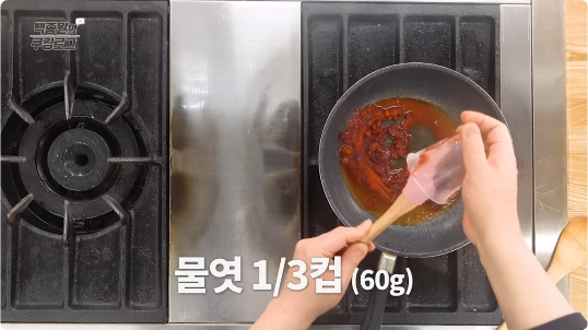 1. 프라이팬에 고추장 1/3컵, 고운 고춧가루 1/4컵, 물엿 1/3컵, 황설탕 1/4컵, 물 1/6컵을 넣고 잘 저어가며 설탕이 녹을 때까지 끓여준다.