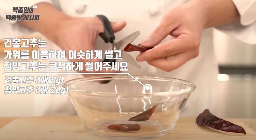 3. 건홍고추는 가위로 어슷 썰고, 청양고추는 큼직하게 썰어준다.