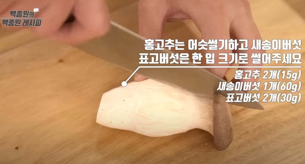 4. 홍고추는 어슷 썰고, 새송이버섯과 표고버섯은 한 입 크기로 썰어둔다.