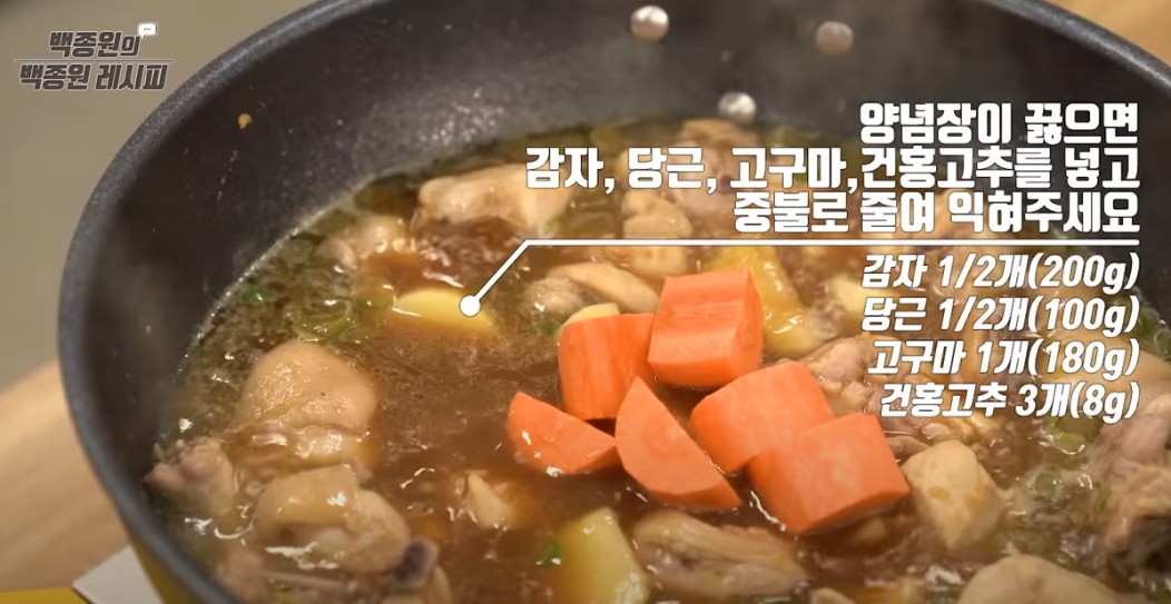 9. 닭이 어느 정도 익으면 건고추를 넣고 강불에서 끓이다가 당근, 감자, 고구마를 넣고 중불로 줄여서 익혀준다.