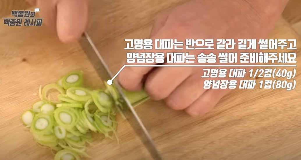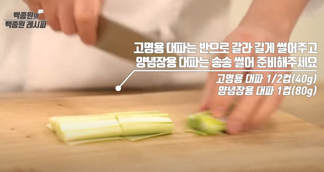 2. 대파는 반으로 갈라서 길게 썰고, 양념장용 대파는 송송 썰어준다.