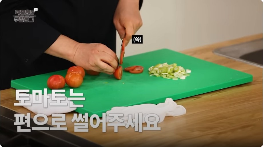 1. 토마토를 깨끗이 세척해 꼭지를 제거하고 썰어준다.