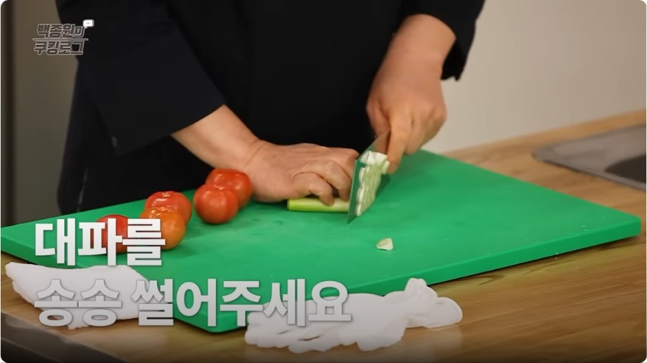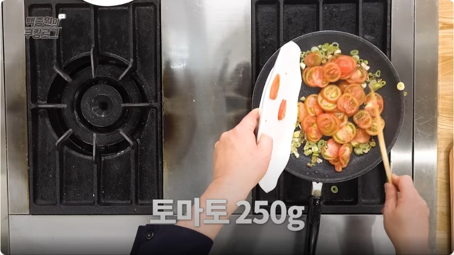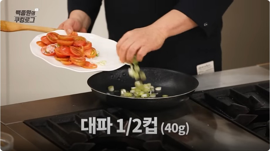 5. 대파가 노릇해지면 토마토를 넣어 볶아준다.