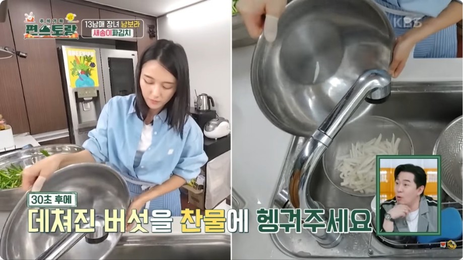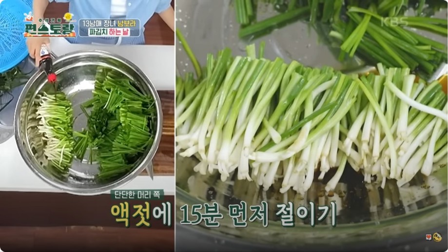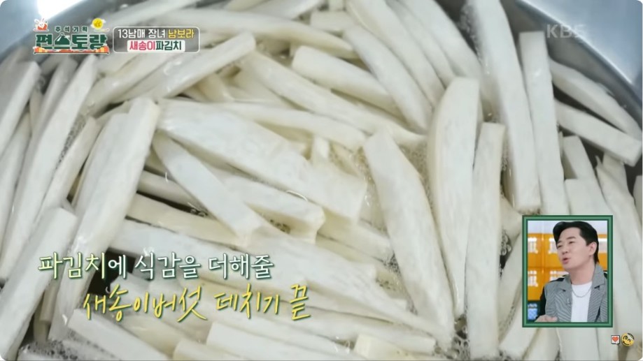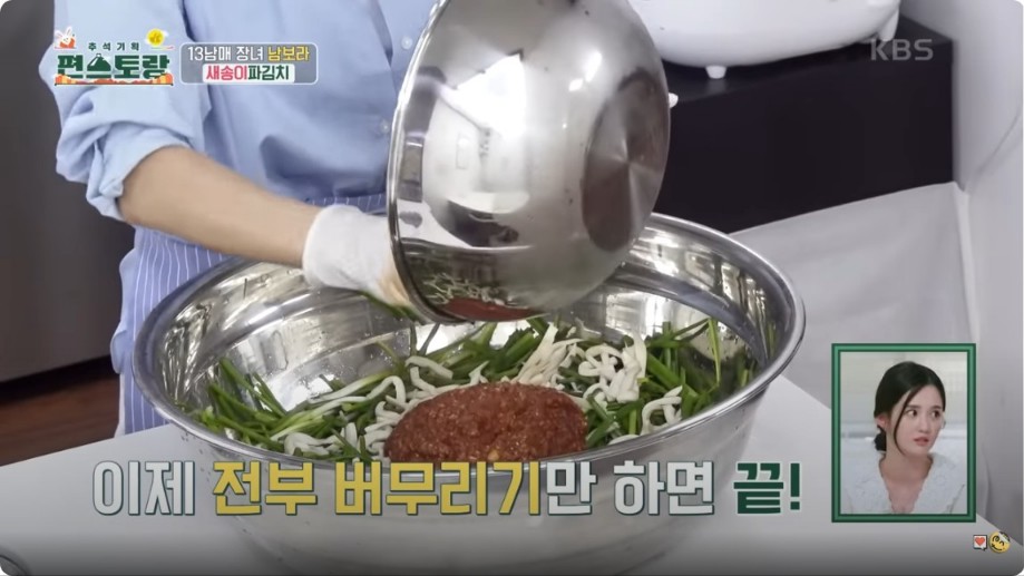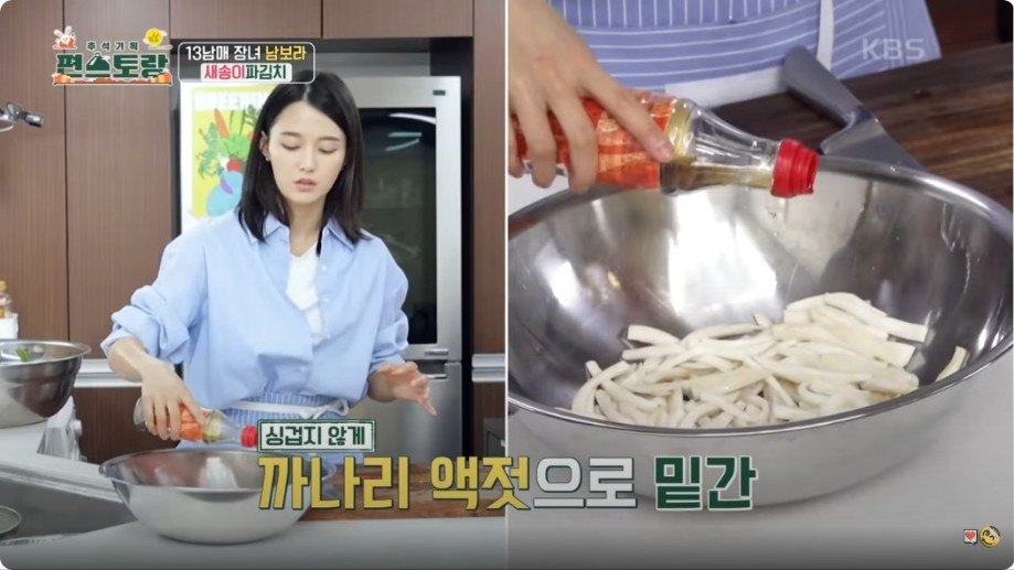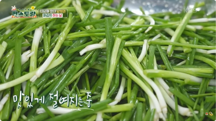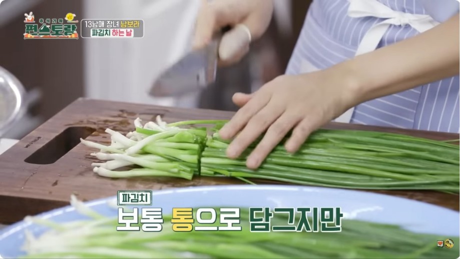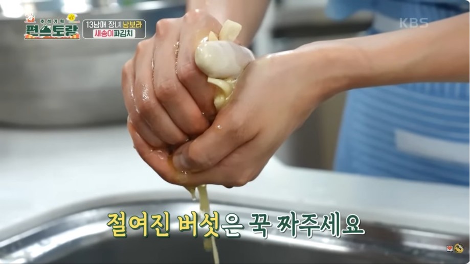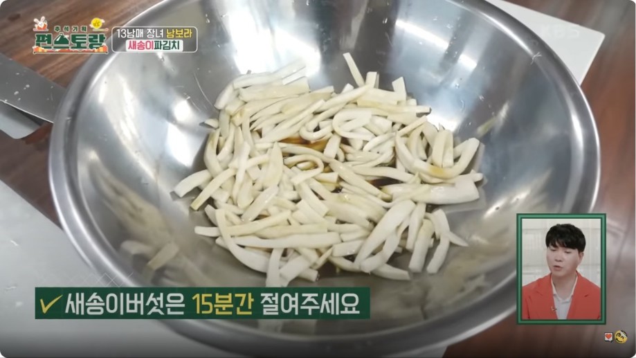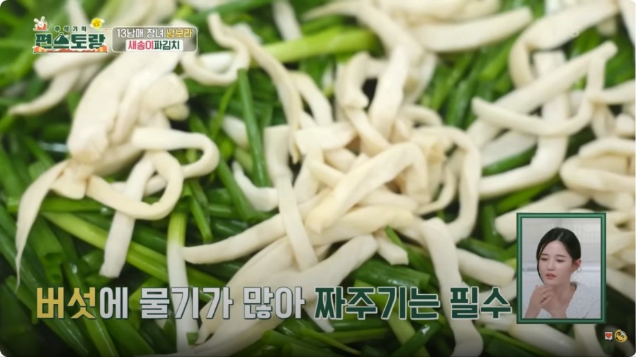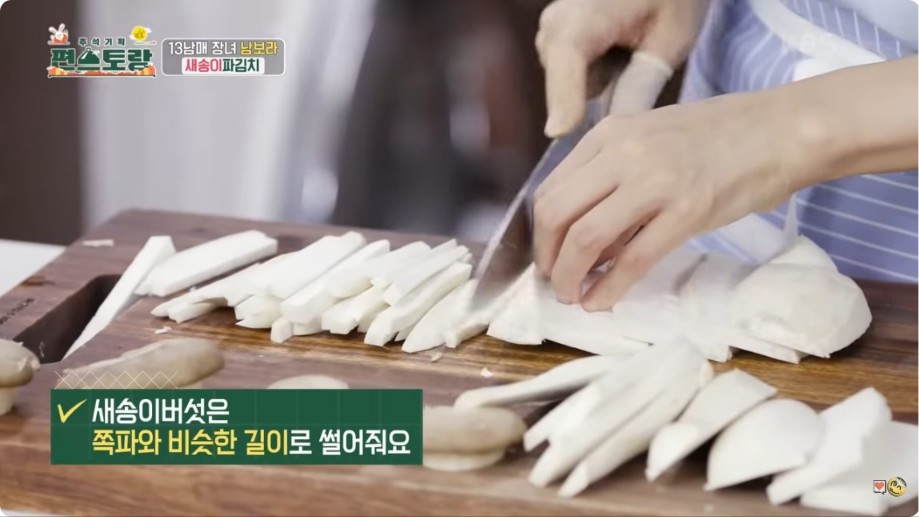 새송이 버섯의 식감이 더해져 더 맛있는 편스토랑 남보라 새송이 파김치 레시피입니다.