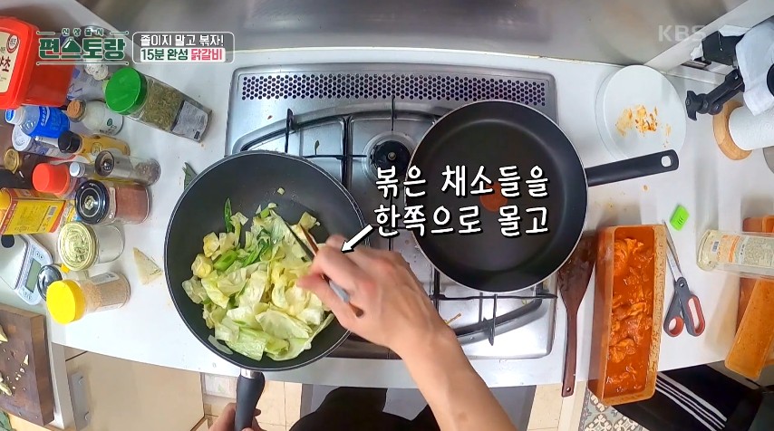 8. 볶은 채소를 한쪽으로 몰고, 빈 공간에 양념한 닭다리살을 넣고 중불에서 볶는다.