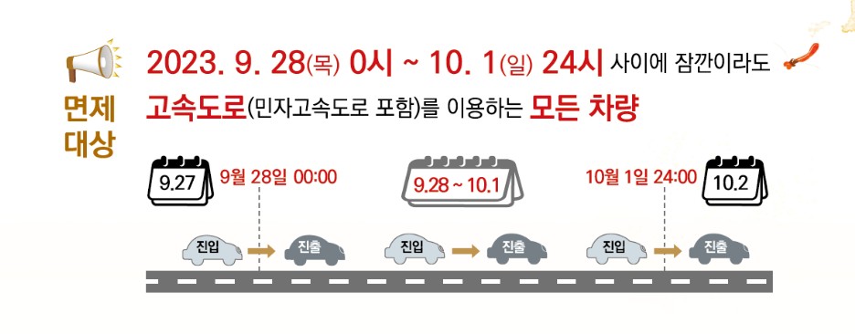 23년 9월 28일(목) 0시 ~ 10월 1일(일) 24시 고속도로(민자고속도로 포함) 통행료 면제